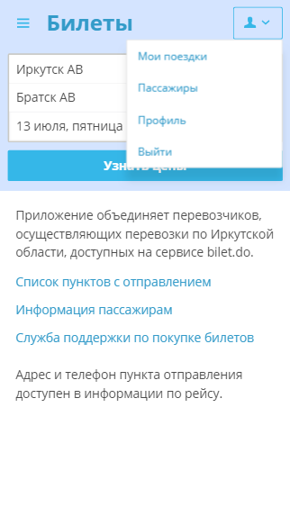 Aplikasi untuk pembelian tiket bus untuk wilayah Irkutsk.