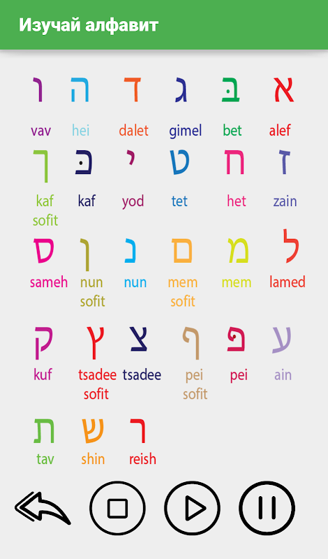 Благодаря приложению, вы легко выучите буквы еврейского алфавита. После изучения, вы сможете проверить свои знания с помощью теста. Приятными дополнениями, будет песня "АлефБет" и стих "Алфавит". Вы закрепите свои знания и сможете смело начинать читать на иврите.