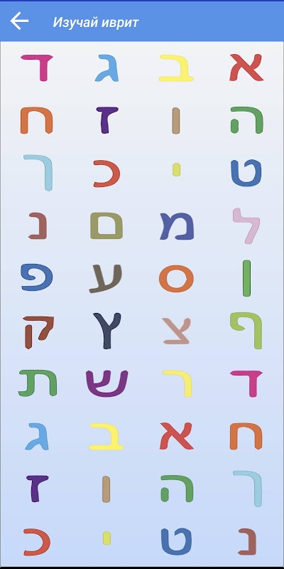 Berkat aplikasinya, Anda dapat dengan mudah mempelajari huruf-huruf alfabet Ibrani. Setelah belajar, Anda dapat menguji pengetahuan Anda dengan kuis. Tambahan yang menyenangkan adalah lagu "AlefBet" dan bait "Alphabet". Anda akan mengkonsolidasikan pengetahuan Anda dan dapat dengan aman mulai membaca dalam bahasa Ibrani.