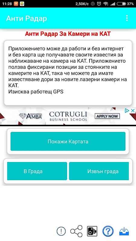 Приложението може да работи и без карта (ако искате да спестите трафик) ще получавате своите известия за наближаване на камера на КАТ. Приложението ползва фиксирани позиции за стоянките на камерите на КАТ, така че можете да имате известяване дори за новите лазерни камери на КАТ.