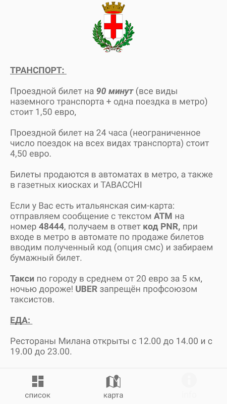 Dalam informasi aplikasi yang berisi semua informasi yang diperlukan pada transportasi di kota terhubung ke Internet dan, tentu saja, tentang belanja, salah satu hiburan Milanese utama.