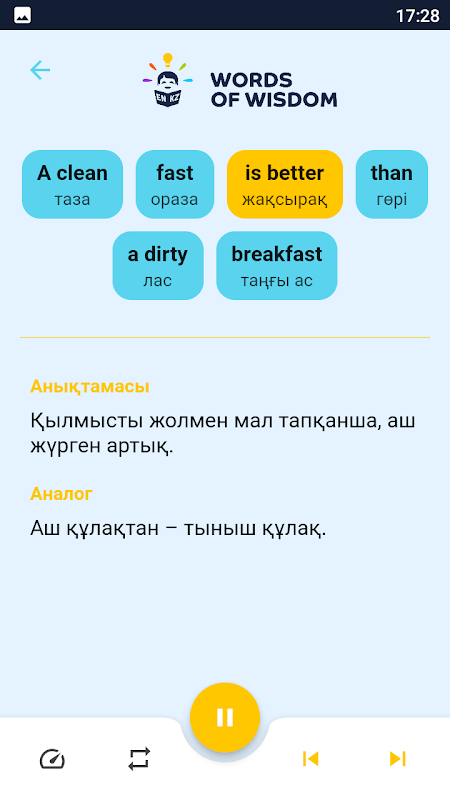 Cara yang bagus untuk mengembangkan keterampilan bahasa Anda dan meningkatkan bahasa Inggris Anda adalah dengan mempelajari peribahasa bahasa Inggris. Aplikasi mobile Words of Wisdom berisi 1000 peribahasa bahasa Inggris. Setiap peribahasa memiliki terjemahan yang setara, setara, atau literal dalam bahasa Kazakh. Juga, ada penjelasan yang membantu memperjelas artinya dan menguasainya sepenuhnya. Anda akan mempelajari arti lebih dari 3.000 elemen peribahasa dalam aplikasi seluler dan mendengar pengucapannya. Pada saat itu, banyak koneksi saraf baru terbentuk di otak, informasi disimpan dengan baik di ingatan Anda, dan pengetahuan yang Anda peroleh sudah mapan.