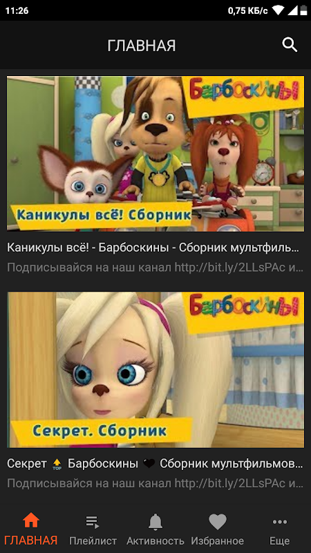 Все ссылки на мультфильмы получены с использованием официального API Youtube. В качестве источников использованы Youtube канал - "Барбоскины", предоставивший мультфильмы в открытый доступ. Проигрывание мультфильмов происходит в плеере Youtube.