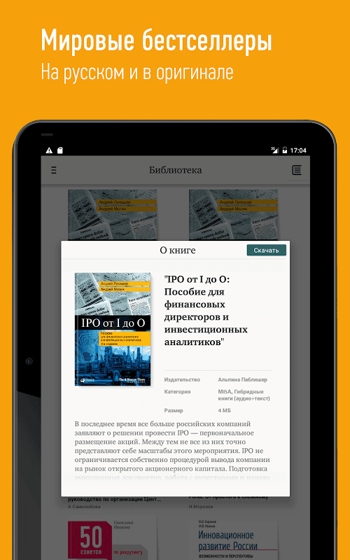 Библиотека Coca-Cola HBC ― это коллекция книг охватывающая самые актуальные темы и проблемы современного бизнеса. Она открывает доступ к сотням книг по главным направлениям деловой и научно-популярной литературы в электронном виде. Книги издательств Альпина Паблишер, Альпина Нон-фикшн и Интеллектуальная литература можно читать с любого устройства и в любое удобное время, даже без активного интернет-соединения.