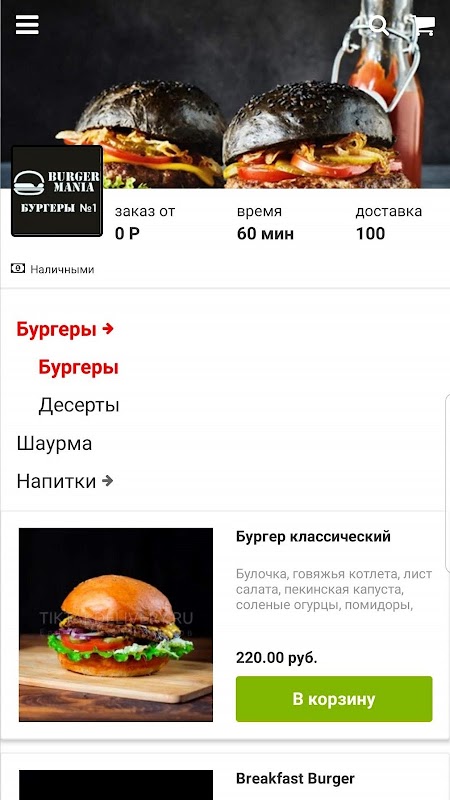 Aplikasi untuk mengantarkan makanan dari restoran "Burger Mania" di Nalchik!