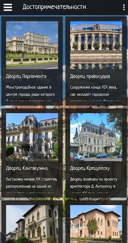 В этом приложении можно совершить первичное знакомство с Бухарестом, выбрать место для путешествия, посмотрев достопримечательности и видео обзоры. Также в приложении есть информация об экскурсионных бюро и отелях, предлагающих свои услуги в Бухаресте.