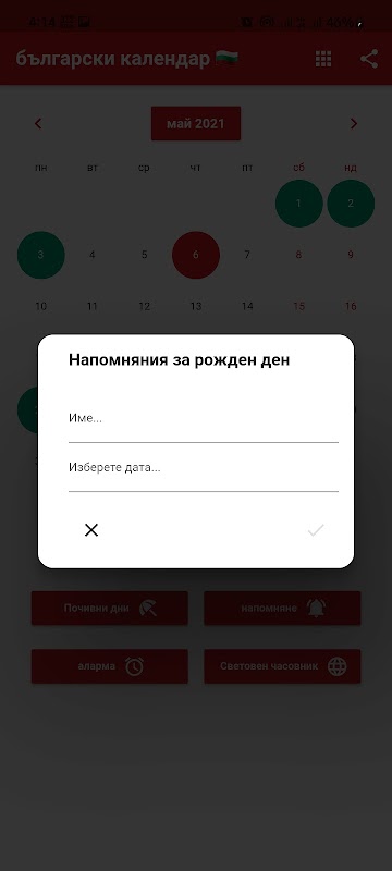 Kalender Bulgaria memiliki hari libur, pengingat, kalkulator, alarm, ulang tahun.
