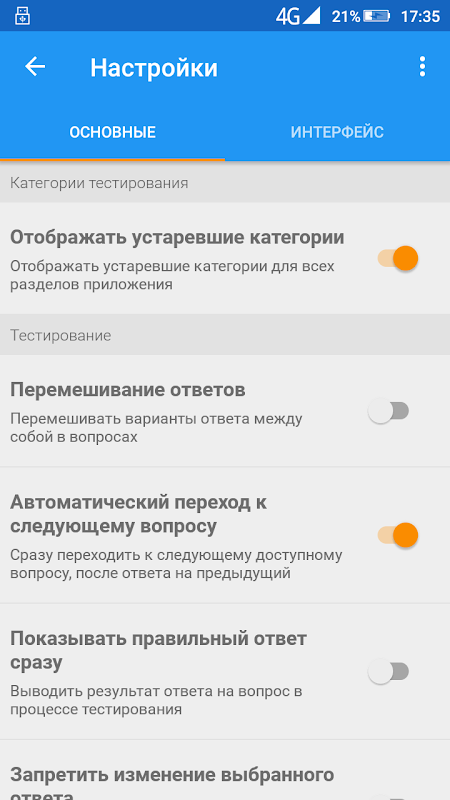 - режим "Обучение", который позволяет поэтапно изучить все вопросы выбранной категории