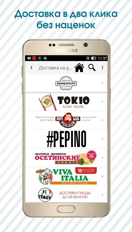 • pengiriman makanan. Pizza, sushi dan buuzy dari kafe terkemuka dan restoran di kota - Pepino, Makburgers, Yaposha roll, Zen Pizza, Subway dan banyak lainnya.