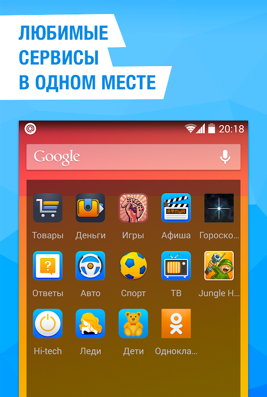 — витрина приложений (Мой Мир, Агент, Почта, Облако, Товары, Деньги, Афиша, Гороскопы, Ответы, Авто, Спорт и многое другое), в которой показывается количество уведомлений, присланных сервисами;