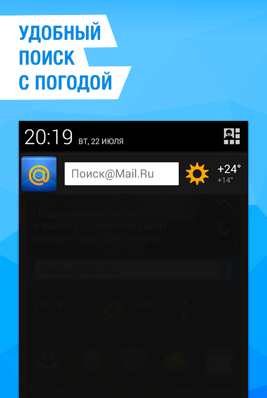 Виджет Mail.ru — это все лучшие сервисы Mail.ru (Мой Мир, Агент, Почта, Облако, Календарь, Товары, Деньги, Афиша, Гороскопы, Ответы, Авто, Спорт и многое другое) в одном функциональном виджете, а также погода, новости, курс валют и поиск.