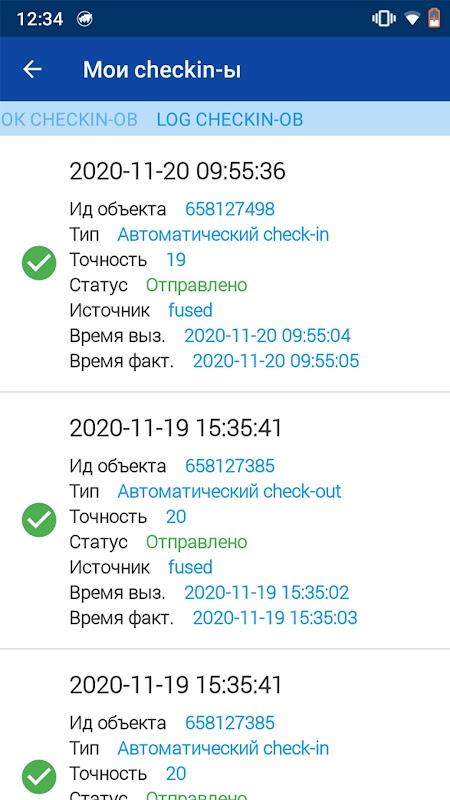 Sebagai bukti kunjungan klien pada waktu dan tempat yang tepat, aplikasi dapat melakukan check-in (stempel lokasi), meskipun aplikasi ditutup atau tidak digunakan. Check-in dilakukan secara otomatis di awal dan akhir rapat sesuai jadwal Anda. Selanjutnya, data ini dikirim ke sistem utama "Orient Express", dan manajer akan dapat mengontrolnya dalam laporan.