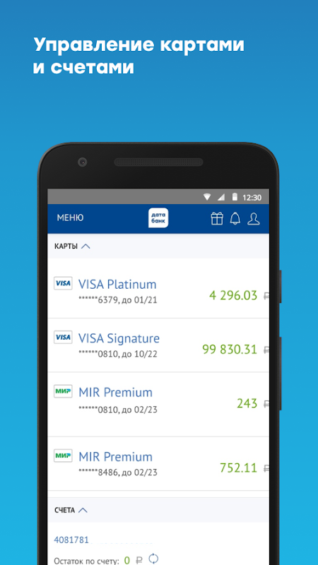 - transfer dana antara kartu dan rekening Anda, ke klien Bank Data dan bank lain,