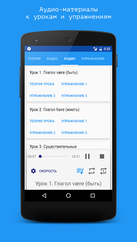 - materi audio yang menjelaskan pelajaran dan latihan (tersedia offline)