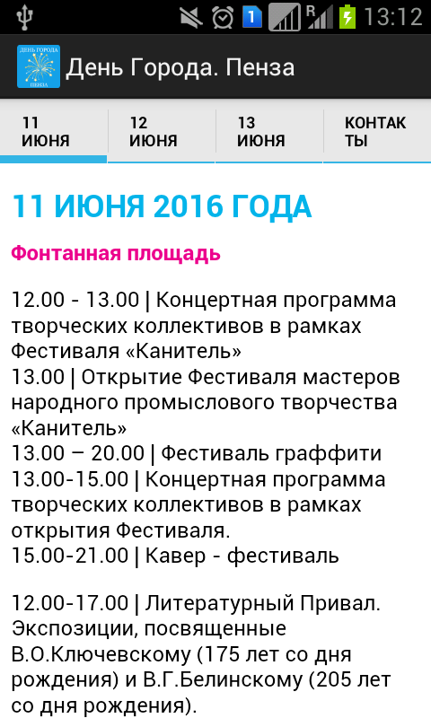 С приложением "День Города. Пенза" Вы сможете узнать программу праздничных мероприятий на 10-13 июня 2016 г, проходящих в городе Пензе на различных площадках.