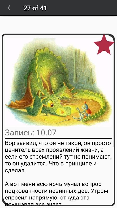 "Notes of the Dragon" - cerita fantastis oleh Nadezhda Mamaeva, genre fantasi lucu. Kisah Vicomtesse yang gemar bertualang dan wali naga dengan rasa humor tertentu. Ceritanya terdiri dari dua bagian: "The Dragon Diary" dan "Dragon Summary"