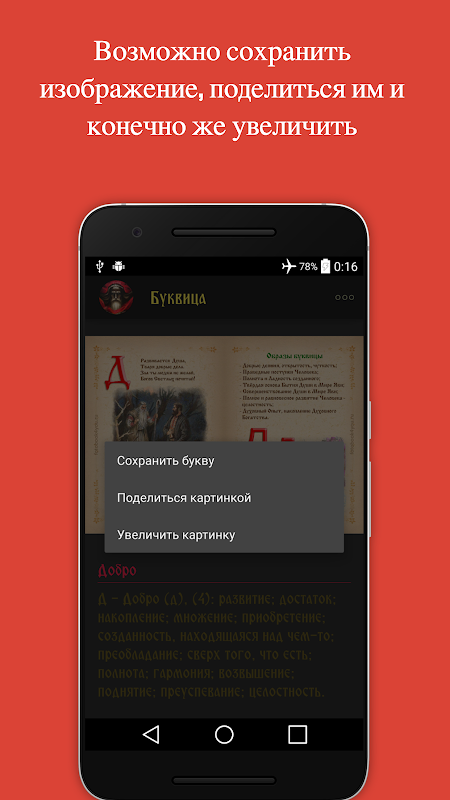 Aplikasi ini juga memiliki kalender libur Slavia. Mengklik pada bagian bawah, Anda dapat melihat deskripsi singkat dari liburan dan tradisi yang terkait. Untuk informasi lebih lanjut tentang festival Slavia dapat diperoleh secara langsung dari program dengan bantuan Google dan Yandex.