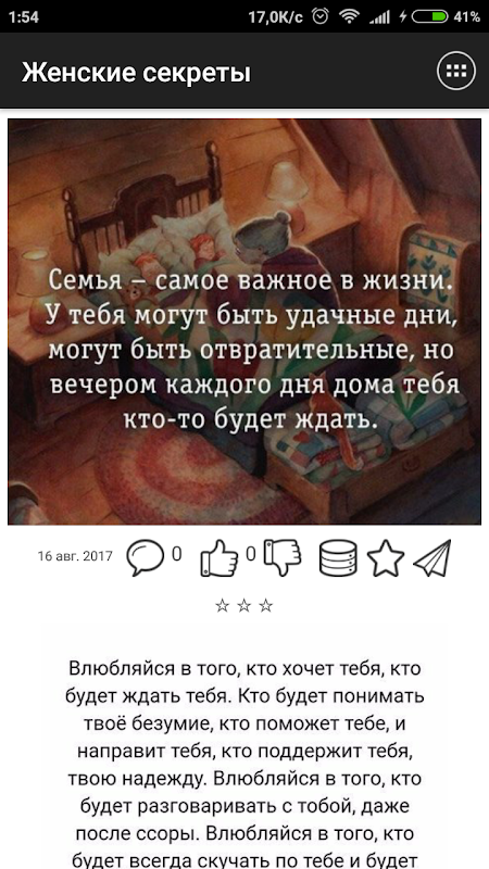 Понравившиеся записи можно комментировать и оценивать. Все понравившиеся картинки можно сохранять в галерее устройства в папке приложения. Ты можешь делиться записями с друзьями через социальные сети Facebook, Вконтакте, Одноклассники, Viber, WhatsApp а так же другие установленные на устройстве приложения. Ну и конечно, ты можешь оставлять лайки и сохранять записи в избранное.