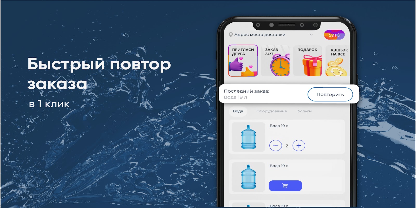 Dalam aplikasi, Anda dapat memesan air dan minuman dengan volume berbeda: mulai 0,5 liter. botol hingga botol 19 liter. Selain air, ada semua komponen yang diperlukan: cangkir, pompa, dan pendingin.