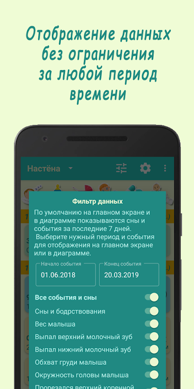Дополнительный модуль для приложения «Жизнь малыша». Позволяет выбирать любой период для отображения данных в приложении без какого-либо ограничения. Например с 01.02.2018 по 20.07.2020.