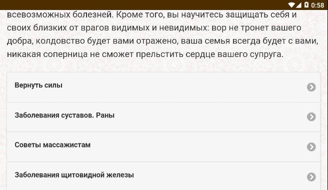 Собранные в этом справочнике молитвы и заговоры, это народный опыт и мудрость, накопленные за века. А теперь просто установите это приложение, и заговоры целительниц в удобной форме буду у вас всегда под рукой на смартфоне.