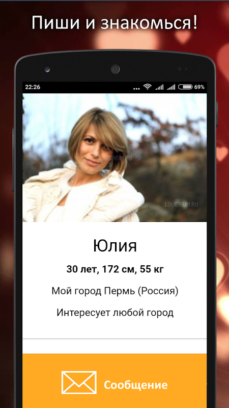 Многие задаются вопросом – Как найти себе девушку (парня)? Скромных людей очень много и не каждый решится подойти к человеку, который понравился. На помощь таким людям и приходит сайт знакомств и наше приложение. Каждый сможет проявить себя онлайн, ведь это гораздо проще. Страха первого разговора больше нет!