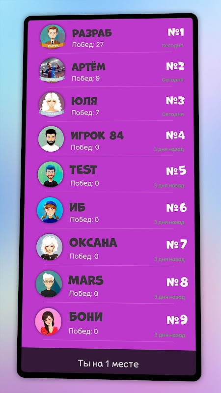 Gim ini menawarkan 3 mode gim: gim cepat, kejuaraan seru, dan pertarungan antara yang terkuat hingga yang tercanggih. Mainkan dan dapatkan status baru, mulai dari “Newbie” menjadi “Master of Intellect”. Buka pencapaian baru dan bandingkan hasil Anda dengan teman. Menang! Dan nama Anda pasti akan menghiasi daftar kehormatan kami yang terbaik.