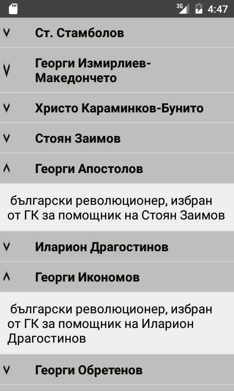 - "Теми" (наличен в платената версия на приложението (https://play.google.com/store/apps/details?id=com.goodlab.bgrenpaid) ще откриете българската история, разбита на 27 подтеми (първите години на развитие в рамките на Османската империя до освободителната Руско-Турска война).