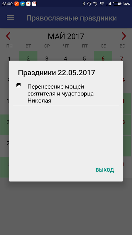 Aplikasi ini memiliki kalender yang memungkinkan Anda memilih tanggal yang diinginkan dan melihat semua hari libur pada hari ini.