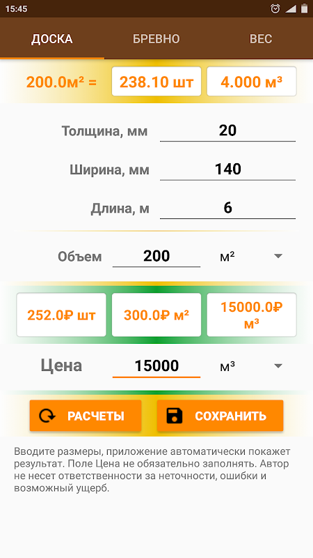 Juga dengan aplikasi dapat membantu untuk mengetahui harga untuk satu papan, untuk meter persegi atau meter kubik sekali, hanya menentukan salah satu dari mereka.