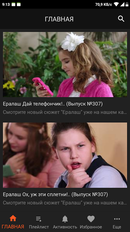 Все ссылки на видео получены с использованием официального API Youtube. В качестве источников использованы Youtube канал - "Ералаш", предоставивший фильмы в открытый доступ. Проигрывание видео происходит в плеере Youtube.