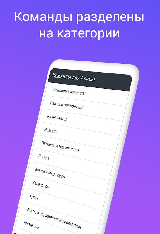 Приложение "Команды Алисы голосовой помощник" позволяет легко и быстро найти ответы на все интересующие вопросы. Приложение содержит большой перечень команд для ассистента Алиса.