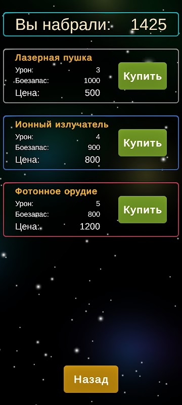 Каждый вид излучателей имеет свою цену, урон по цели и ограниченный боезапас. При исчерпании боезапаса излучатель исчезает и на вместо него можно приобрести новый.