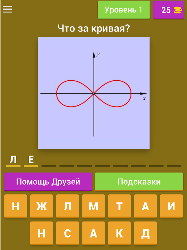 Для того, чтобы пройти уровень, тебе надо внимательно изучить изображение и угадать название изображённой кривой, математического термина или имя известного учёного. Угадав слово, ты открываешь новый уровень в викторине. С каждым обновлением количество уровней будет увеличиваться. Данная версия игры исполнена на русском языке.