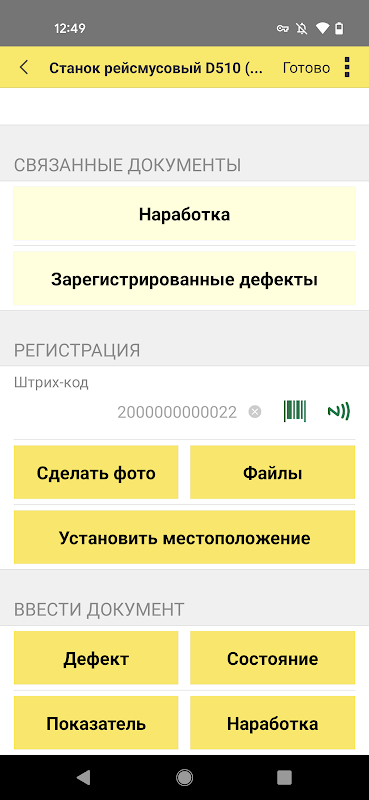 Pengguna memiliki akses ke informasi dalam sistem 1C:TOIR CORP untuk menerima tugas perbaikan, rute inspeksi (perintah untuk pemeliharaan rutin), dan informasi referensi yang diperlukan. Mereka juga dapat dengan cepat merekam penyelesaian pekerjaan, dan mentransfer dokumen, berkas audio dan video, foto, koordinat geografis, kode batang pindaian, dan tag NFC dari objek yang diperbaiki yang dibuat di perangkat seluler ke basis data 1C:TOIR CORP.