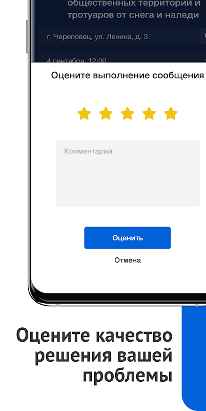 Kirim pesan sesuai dengan jenis masalah yang tersedia. Pengajuan banding Anda akan otomatis masuk ke organisasi yang tepat. Anda dapat memantau kemajuan pekerjaan pada pesan Anda, memantau perubahan status. Jika ada pertanyaan klarifikasi, obrolan disediakan antara pengguna (residen) dan operator dari organisasi yang bertanggung jawab untuk menghilangkan masalah ini. Setelah menyelesaikan pekerjaan, Anda dapat mengevaluasi kualitas layanan yang diberikan atau menolak keputusan jika Anda tidak puas dengan keputusan yang dibuat oleh kontraktor.