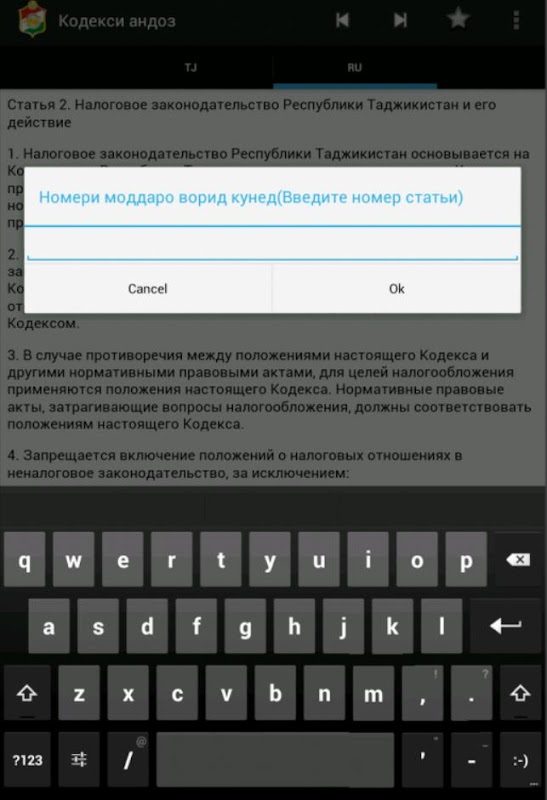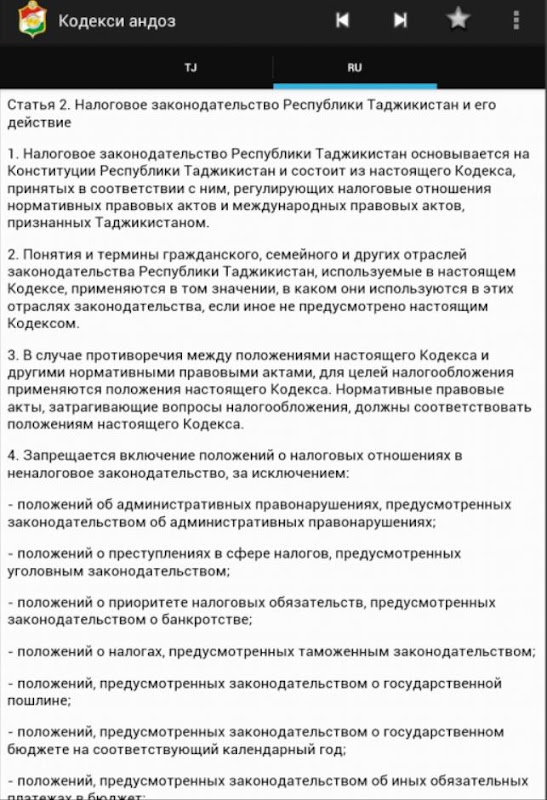 Налоговый Кодекс Республики Таджикистан на платформе Android - приложение, работающее в режиме Off-line, не требует подключения к Интернет и позволит Вам всегда иметь при себе Налоговый кодекс РТ.