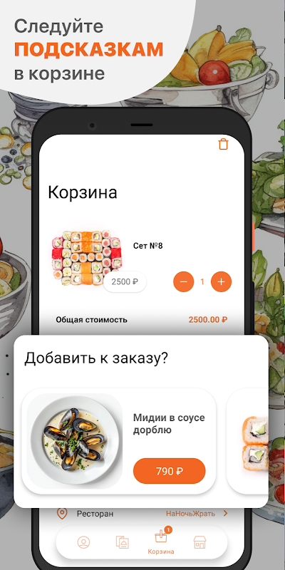 Aplikasi mobile "Pada malam hari, makan" memberikan panas pizza yang lezat untuk setiap selera, pasta, salad, berbagai hidangan Jepang dan minuman.