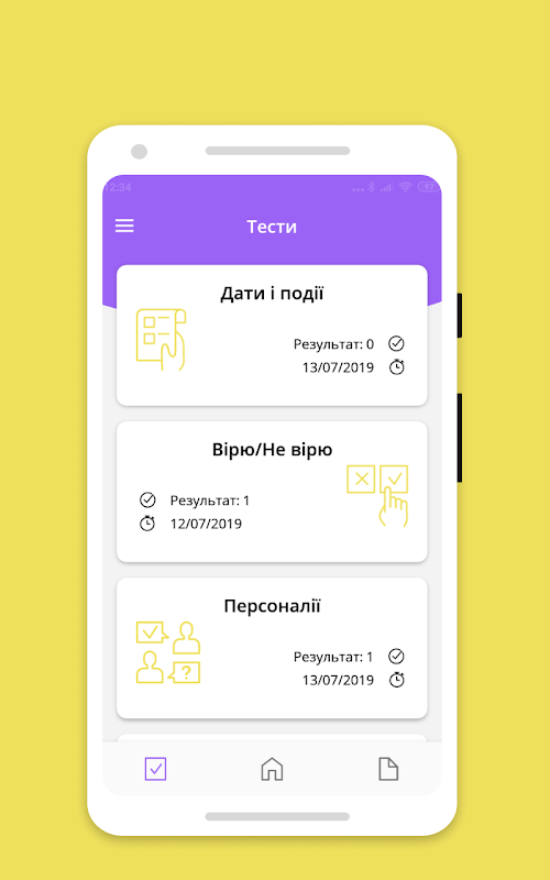 • Tes non-standar. Selain tugas pencocokan tanggal dan peristiwa yang biasa, kami sarankan untuk menguji pengetahuan Anda tentang kepribadian dan tempat-tempat bersejarah. Selain itu, kami juga menawarkan format unik "Saya percaya/Saya tidak percaya", yang melatih perhatian dan akurasi: Anda perlu menentukan kebenaran fakta yang diberikan.