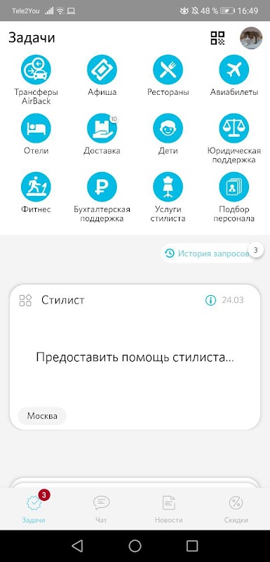 Riwayat semua permintaan dan pembelian melalui layanan pramutamu disimpan di bagian "Tugas" dan "Akun". Dalam "Berita" - yang terbaru dari bidang perjalanan dan budaya, serta kalender acara, yang dengannya Anda dapat membuat jadwal sendiri untuk bulan itu. Bagian "Diskon" yang terus diperbarui akan memberi tahu Anda tentang penawaran dan hak istimewa yang menarik.
