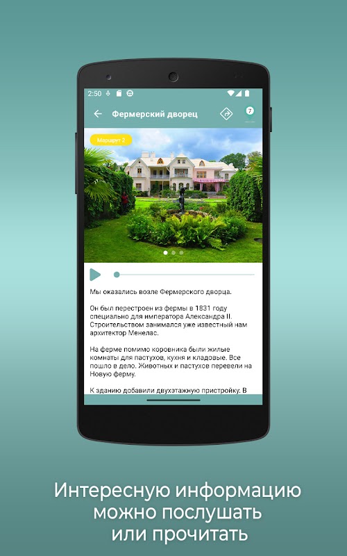 Unduh peta terlebih dahulu untuk menggunakan aplikasi secara offline, atau cukup pilih salah satu rute yang disarankan dan jelajahi kota. Rekaman akan mulai diputar segera setelah Anda mendekati tempat tujuan. Berhenti merekam kapan saja atau dengarkan lagi. Perjalanan Anda akan informatif dan mengasyikkan! Sekarang kota Peterhof akan membuka rahasianya untuk Anda.