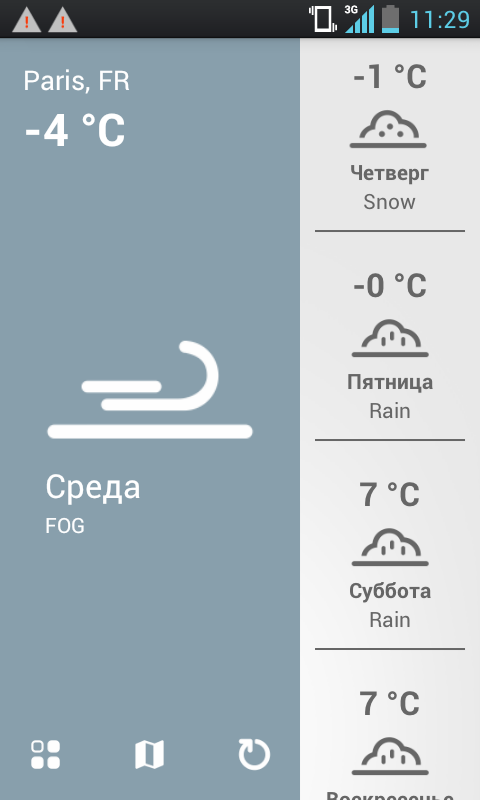 Внимание: после первой загрузки приложения необходимо нажать на иконку обновления данных, чтобы на экране Вашего смартфона или планшета отобразилась погода именно Вашего города!