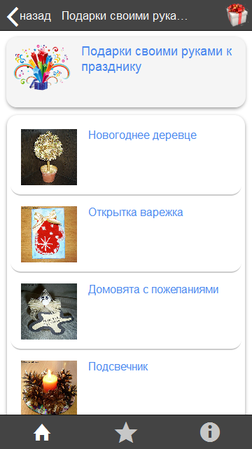 Данное приложение имеет несколько категорий самых распространенных праздников со списком оригинальных подарков (поделок), сопровождающихся пошаговыми инструкциями по их изготовлению в графическом представлении.