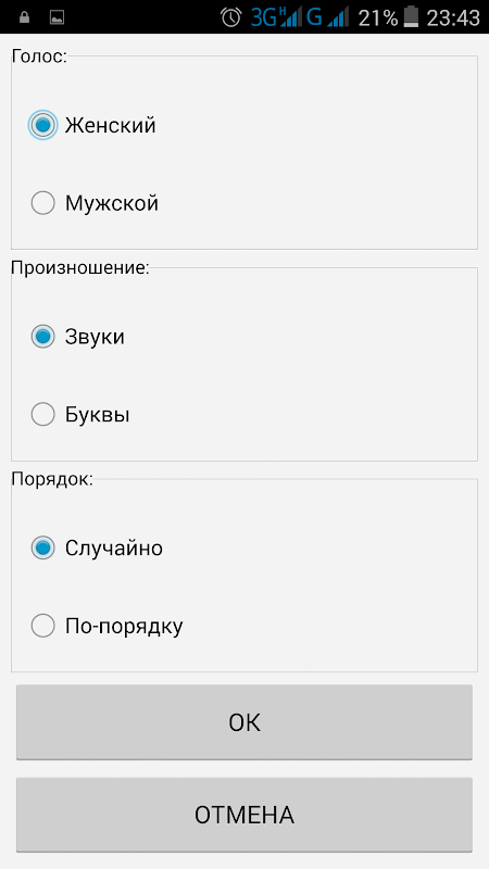 Произношение можно выбрать: звуки или буквы (типа "нэ" или "эн").