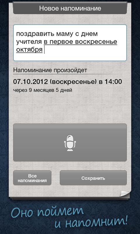 Приложение понимает самые разные конструкции времени. Вам не надо выбирать слова, просто говорите так, как думаете. Если программа вдруг вас не поймет, свяжитесь с нами, и мы ее научим!