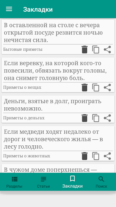 Приметы и суеверия в приложении разделены на следующие разделы:
