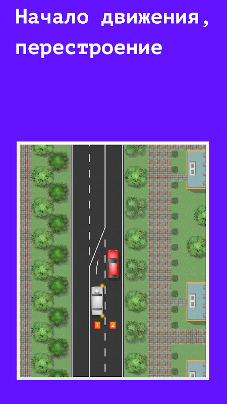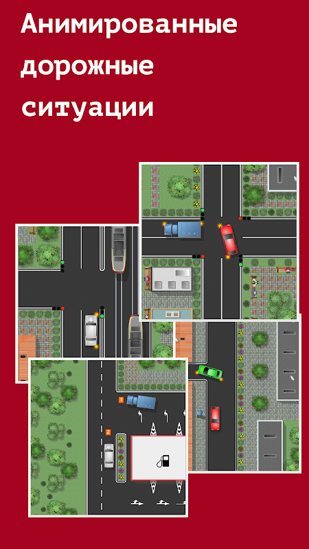 Situasi lalu lintas animasi memungkinkan Anda untuk lebih memahami topik dan akan menjadi tambahan yang bagus untuk menyelesaikan tiket ujian teori tentang pengetahuan peraturan lalu lintas untuk SIM di polisi lalu lintas.