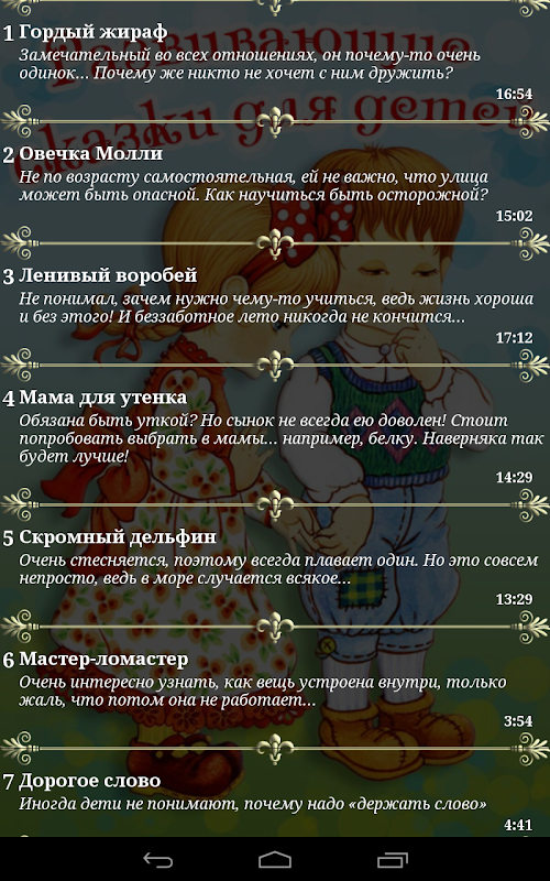 Далеко не все сказки, которые мы читаем нашим детям, полезны для их развития. Большинство из них тренирует воображение, и это хорошо, но многие описывают неприемлемые модели поведения, например, когда обман, лень и предательство приводят к благополучию. Однако в реальной жизни все эти установки приводят к разочарованию, духовной и материальной несостоятельности. Мы предлагаем вашему вниманию серию аудиокниг из двух частей для детей, написанных ведущими авторами - психологами. Забавные и легкие музыкальные сказки скрывают в себе основы главных принципов мировоззрения и моральных ценностей, необходимых любому человеку. Как правило, мы не в силах повлиять на окружающих, но можем изменить к лучшему частицу нашей личности. Чем раньше ребенок это осознает , тем больше времени и сил сохранится у него для работы над собой и успешного пути к вершинам».
