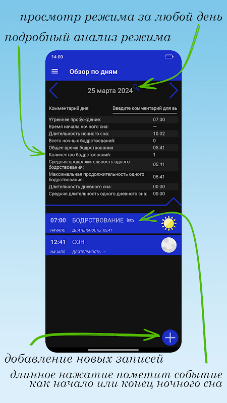 - Ada kemungkinan untuk menambahkan catatan di masa mendatang – asisten yang baik untuk memodelkan rezim dan membuat rencana. Harap diingat untuk menghapus atau mengubah entri tersebut secara manual.