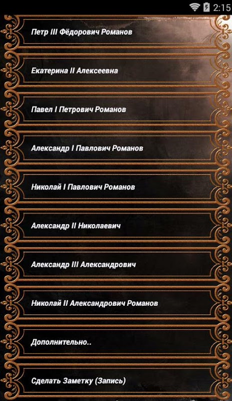 Династия Романовых долгие годы правила Россией,она сменила на престоле династию Рюриковичей, которая после смерти Ивана Грозного прекратилась.В приложении рассказывается история великой династии,загадки,факты и мифы.Более 300 лет у власти в России находилась династия Романовых а поэтому людям которым интересна история России будет не скучно иметь под рукой такое приложение.Династия Романовых сыграла большую роль в истории Российского государства.